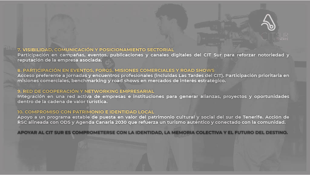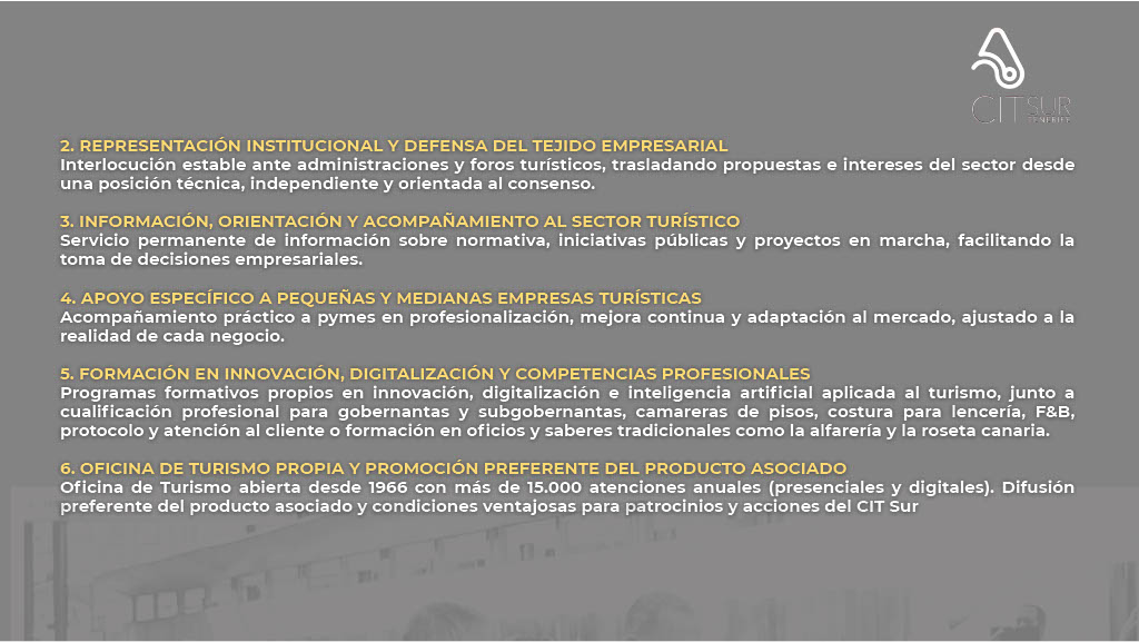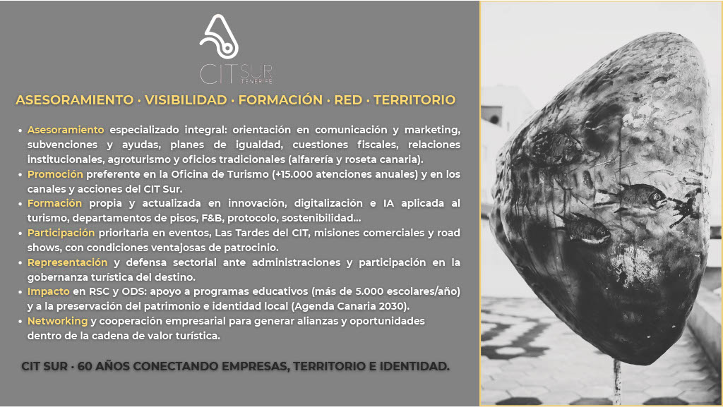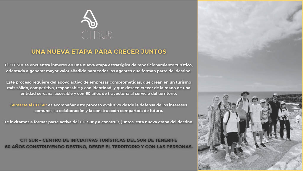 El Centro de Iniciativas y Turismo de las Comarcas del Sur de Tenerife es una asociación sin ánimo de lucro, que aglutina a particulares, empresas y organismos con el objetivo común de promover el progreso constante en esta zona de la Isla.